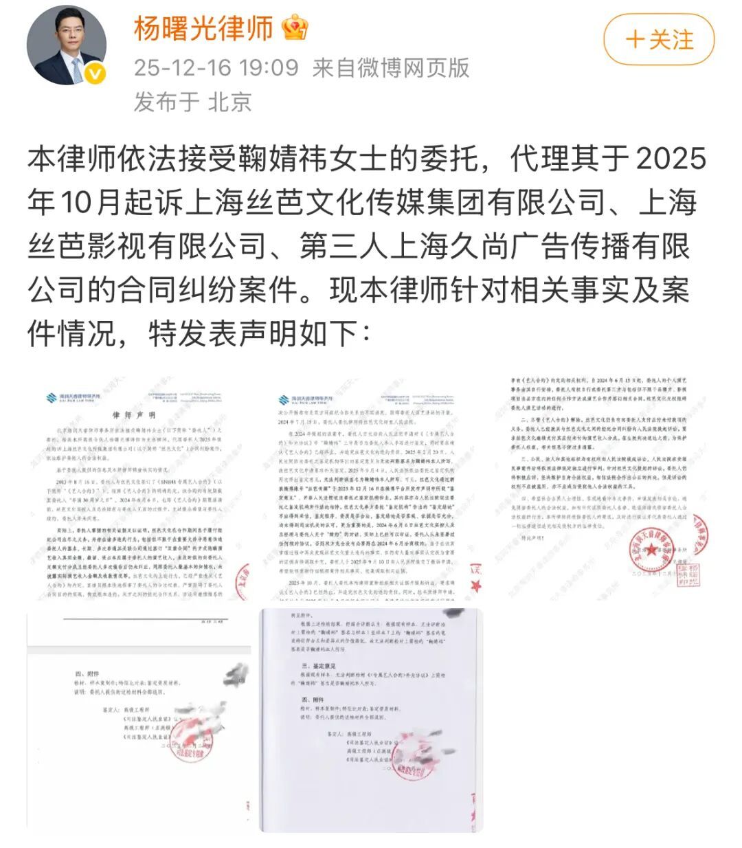 丝芭传媒方律师发布声明图/微博