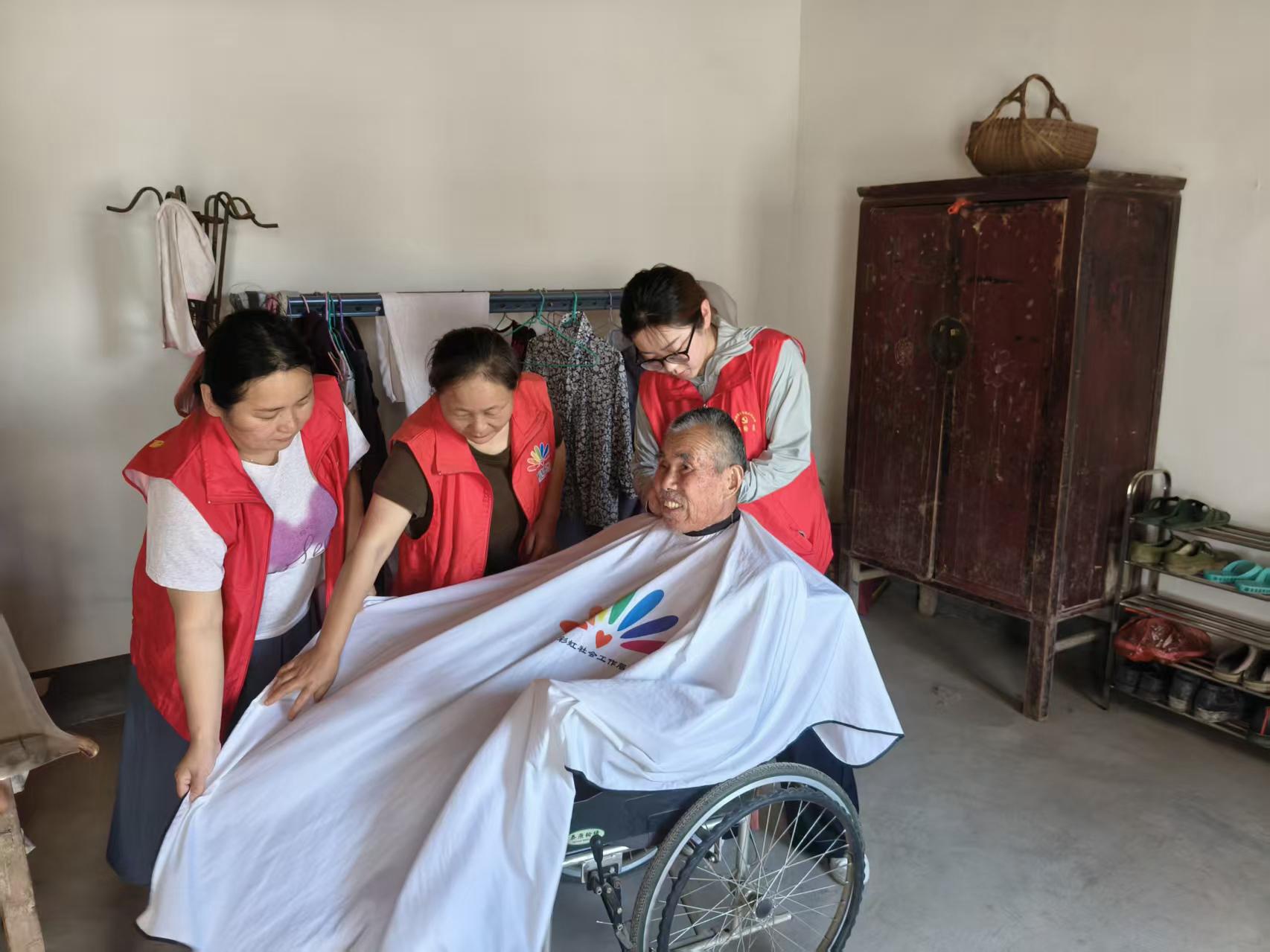 李彤(右一)为村民理发配资查询之家。(新桥村村委会供图)