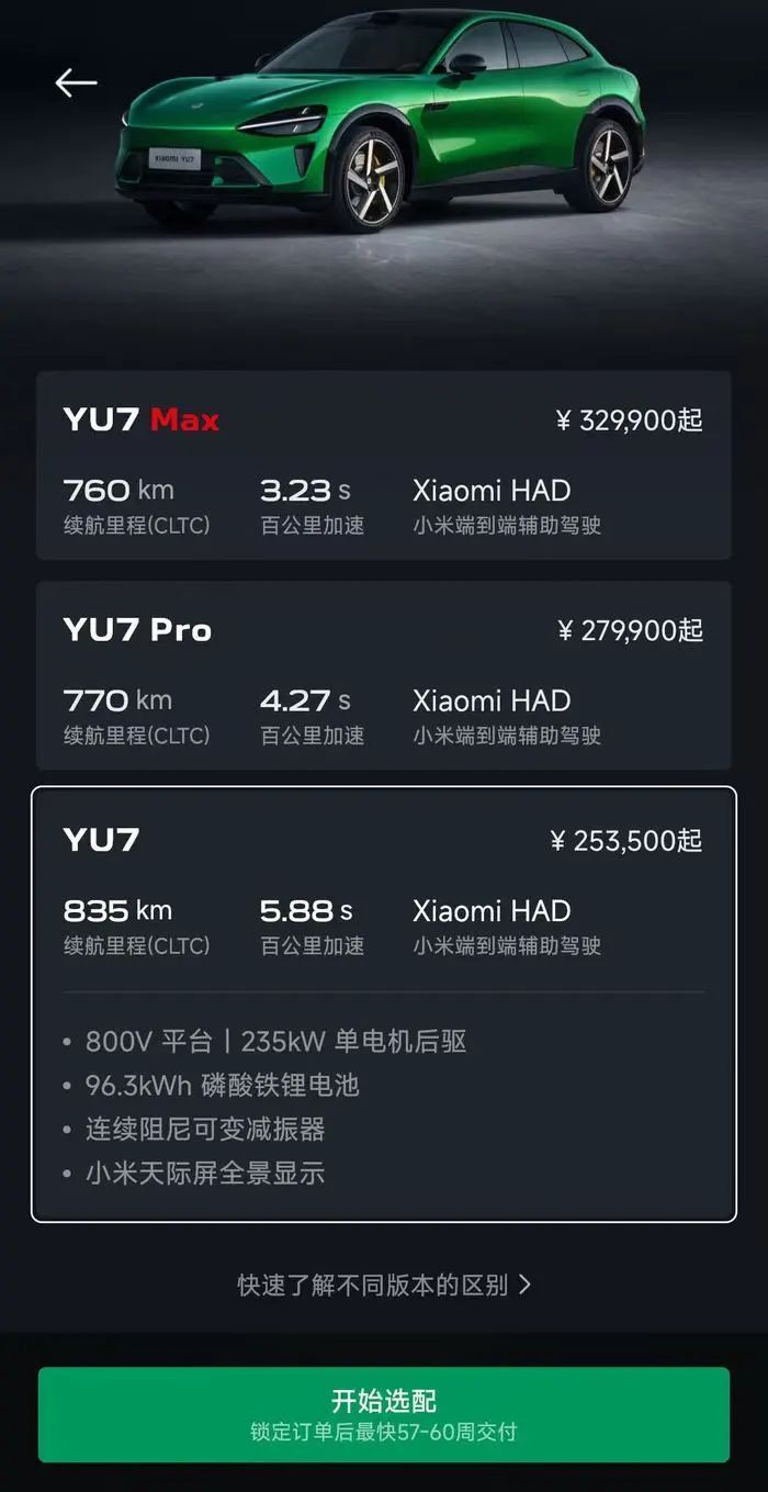 界面新闻查询小米汽车APP发现,目前小米YU7标准版锁单后交付周期为57-60周,Pro版为50-53周,就连最快的小米YU7 Max版的交付周期也长达37-40周。